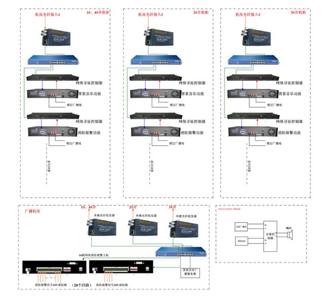 泰州碧桂園五星級大酒店位于江蘇省泰州市海陵區(qū)泰東河大橋北側,地處生態(tài)旅游區(qū)。本次廣播設計安裝全金屬音箱1265只,按照功能分為40個區(qū)域,每個區(qū)域同時播放不同背景音樂;設置中心主控機房一個,分中心機房4個;廣播系統(tǒng)與酒店消防報警系統(tǒng)聯(lián)動實現(xiàn)N-3、N-2、N-1、N、N+1、N+2、N+3報警。