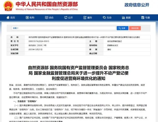 2月1日,自然資源部、國務(wù)院國有資產(chǎn)監(jiān)督管理委員會、國家稅務(wù)總局、國家金融監(jiān)督管理總局發(fā)布關(guān)于進一步提升不動產(chǎn)登記便利度促進營商環(huán)境優(yōu)化的通知。